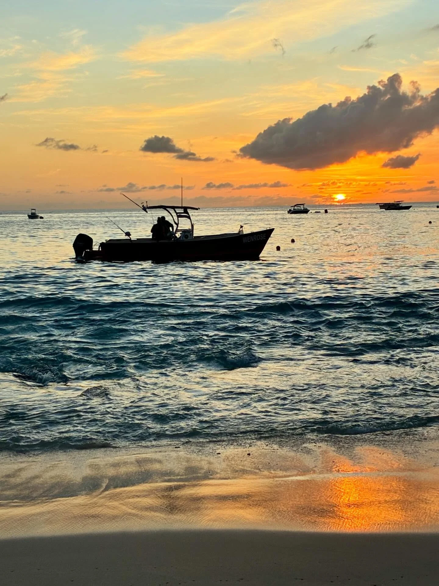 Black-and-white photo of abandoned, wrecked boats on the shore with some partially submerged in water, and a distant sailboat on the calm water in the background.